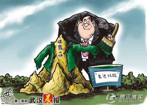 秦嶺在陜西省華縣境內的山體被亂采亂挖,當地為掩飾,用藍色圍欄遮擋采石場,還將山體裸露的石壁用油漆刷成綠色。當地官員稱,此舉是國內最先進的經驗,從網上找的。(9月2日《南方都市報》)