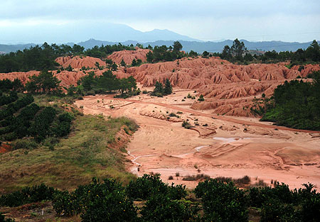 稀土開發(fā)留下的尾砂山 在江西省信豐縣水土保持教育基地,因稀土開發(fā)留下的寸草不長的尾砂山和周圍綠意蔥蘢的橙園形成對比(10月24日攝)。上世紀(jì)80年代,這里的稀土礦區(qū)新增水土流失面積24.68平方公里,排放尾砂近6000萬噸,尾砂山成了“江南沙漠”。 記者