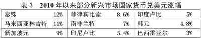 美國量化寬松貨幣政策導致美元貶值,人民幣升值壓力增大。從2010年8月以來,美國已經啟動兩輪量化寬松貨幣政策,并開始醞釀2011年的寬松貨幣政策。這導致美元對日元等西方貨幣一路下跌,并使許多發展中國家貨幣對美元大幅度升值(見表3)。2010年以來,人民幣對美元匯率升值幅度已接近3%。人民幣匯率上升,使我國出口貿易企業經營困難,貿易順差呈下降趨勢。在這種情況下,堅持擴大內需更具有現實意義。