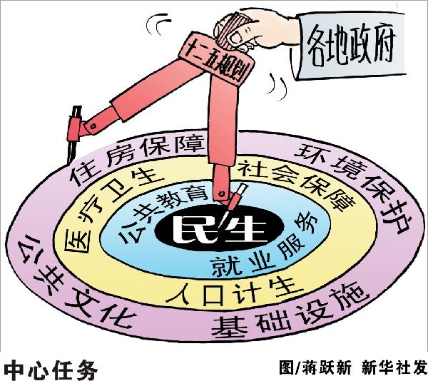 就業與社會保障、教育、醫療、住房等,在13億人口的國度里每一個都是世界級的難題。民生問題解決得好壞,關系著人民的福祉,關乎著民主的前途,決定著國家的命運。“十二五”規劃綱要明確提出:堅持把保障和改善民生作為加快轉變經濟發展方式的根本出發點和落腳點。完善保障和改善民生的制度安排,把促進就業放在經濟社會發展優先位置,加快發展各項社會事業,推進基本公共服務均等化,加大收入分配調節力度,堅定不移走共同富裕道路,使發展成果惠及全體人民。新華社發
