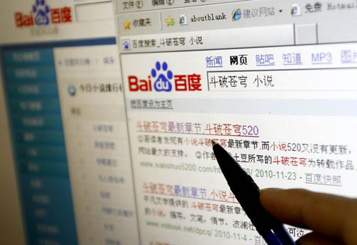 記者調查發現,盛大文學將討伐的矛頭指向百度文庫,認為這里已成為滋生盜版的溫床,盜版模式從單純盜貼文字內容轉變為形成網絡盜版文學利益鏈。百度則認為,相對于收費的盛大文學,百度文庫提供了一個免費的分享平臺。用戶上載分享的內容存在盜版情況,但僅占文庫內容的很少部分。記者 裴鑫 攝 |