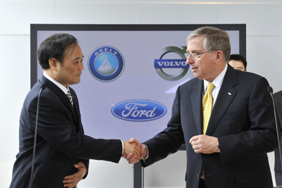 2010年3月28日,在瑞典哥德堡的沃爾沃公司總部,中國(guó)吉利汽車集團(tuán)董事長(zhǎng)李書福(左)與美國(guó)福特汽車公司首席財(cái)務(wù)官萊維斯·布思在簽約后握手。8月2日,吉利集團(tuán)與福特汽車正式完成沃爾沃轎車公司的交割手續(xù),至此,中國(guó)民營(yíng)企業(yè)最大規(guī)模的海外并購(gòu)案走完法律程序,并購(gòu)成功后的吉利集團(tuán)成為中國(guó)第一家跨國(guó)汽車企業(yè)。(資料照片)