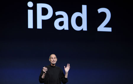 iPad的新款又推出了,但中國的iPad的商標權并不在蘋果之手。 圖為2011年3月2日,蘋果公司首席執行官史蒂夫·喬布斯在美國舊金山舉行的新產品發布會上介紹iPad2。當天,美國蘋果公司推出新一代平板電腦iPad2。 資料照片 |