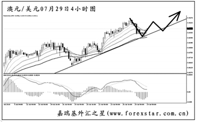 ▲澳元兌美元沿上升趨勢線走強,中間雖然發(fā)生過較為明顯的下調(diào),但漲勢都沒有遭到破壞。圖中出現(xiàn)了MACD底背離信號,同時匯價再度下探趨勢線,現(xiàn)在考驗其支撐力度。預(yù)計澳元直接跌破此線的希望不大,且上漲空間廣闊,后市仍將以沖高走勢為主。
