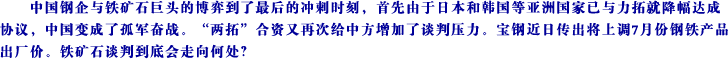 此前中鋼協(xié)已經(jīng)態(tài)度明確地拒絕了日本新日鐵與力拓達(dá)成的首發(fā)價(jià)。單尚華說:“現(xiàn)在中國(guó)買現(xiàn)貨礦比日本談出來的價(jià)格要便宜七八美元/噸。我們的底線沒有改變。”而對(duì)于談判將在6月底見分曉,單尚華直言:“什么時(shí)候達(dá)到中方底線,什么時(shí)候結(jié)束談判。”