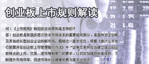 國務院發(fā)布《關于推進資本市場改革開放和穩(wěn)定發(fā)展的若干意見》指出:分步推進創(chuàng)業(yè)板市場建設,完善風險投資機制,拓展中小企業(yè)融資渠道。 |