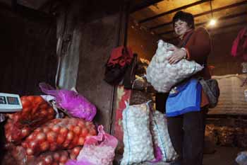 某農貿批發市場一位大蒜批發商正在搬運大蒜。新華社記者 王菲/攝 |