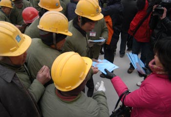 石家莊市職工法律援助團工作人員為農民工現場發放維權宣傳資料。新華社記者 曹國廠