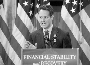 | 10日,美財長蓋特納在財政部宣布新的金融救援計劃。新華社/路透 | 與上任前的咄咄逼人相比,奧巴馬政府在對人民幣匯率問題上的立場正悄悄作出調整。在本周二的一次電視采訪中,新上任的美國財長蓋特納坦言,政府尚未對中國是否“操縱匯率”作出最終判斷,并稱在此事上當局會“小心行事”。這與他上月在國會大談“人民幣匯率操縱”的立場形成鮮明對照。不僅如此,上任不過三周的蓋特納已兩次致電中國國務院副總理王岐山,強調兩國繼續保持密切對話“尤其重要”。