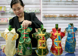 以手工盤扣及織錦緞面料制作的中式服裝酒套,受到許多消費者的喜愛。圖為安徽淮北一家商店的工作人員在給酒瓶套上“中式服裝”。