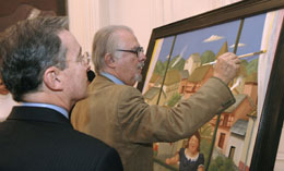 10月27日,在哥倫比亞首都波哥大的總統(tǒng)府,哥倫比亞總統(tǒng)烏里韋(左)看著藝術家博特羅完成作品。這幅由烏里韋與博特羅共同完成的畫作將被拍賣,所得款項將捐給哥倫比亞受傷的士兵和警察。