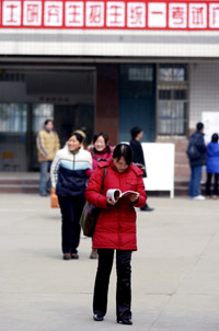 一些專家認為,由于本科生畢業求職期望日趨理性,加上研究生就業前景并不樂觀,考研不再是緩解就業壓力的權宜之計,很多大學生對自己未來的預期和計劃也越來越實際。還有很多學生認為,得到較好的工作機會不容易,所以選擇先就業。圖為一位參加2007年全國碩士研究生招生統一考試的考生考完后在查看資料。