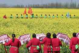 第三屆中國·河橫菜花節(jié)日前在江蘇姜堰沈高鎮(zhèn)河橫村開幕,吸引了眾多游人。河橫村是全國農(nóng)業(yè)旅游示范點(diǎn),曾被聯(lián)合國環(huán)境規(guī)劃署授予生態(tài)環(huán)境“全球500佳”稱號。圖為河橫村的農(nóng)民腰鼓隊(duì)走在油菜田里。