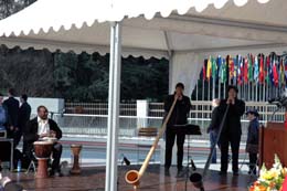 瑞士日內瓦萬國宮廣場新廣場落成典禮上,人們通過踩高蹺和吹長號等方式舉行慶祝活動。本報記者:劉國遠 攝