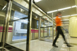 4月28日,今年6月底將開始試運行的北京地鐵五號線對媒體開放。北京地鐵五號線是北京市規劃軌道交通線網中一條重要的南北干線,南起豐臺區的宋家莊站,北至昌平區的太平莊北站。圖為地鐵內的乘車安全門。