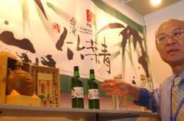 日前于長春召開的第三屆中國吉林·東北亞投資貿易博覽會上,刮起了濃濃的臺灣美食風。由臺北農協組織的30人代表團帶來了許多種臺灣食品。圖為一名參展的臺商在介紹一種來自臺灣的美酒。