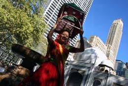 9月23日,在美國紐約曼哈頓,一名印度女子在泰姬陵模型前跳舞。為了紀念印度獨立60周年,印度旅游和文化部與印度產業聯合會在此舉行了為期四天的文化推廣活動。