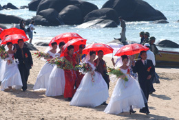 據(jù)一組織集體婚禮的網(wǎng)站負(fù)責(zé)人介紹,從去年5月組織第一屆集體婚禮起,該公司已經(jīng)組織了180對(duì)新人在三亞舉行集體婚禮。隨著婚禮形式的不斷豐富,通過(guò)電話和網(wǎng)站咨詢的年輕朋友也越來(lái)越多。 在該公司推出的婚禮產(chǎn)品中,記者看到了分界洲島海底婚禮、三亞灣畔草坪婚禮、黎族婚宴等形式多樣的獨(dú)特婚慶內(nèi)容。 三亞市旅游部門有關(guān)人士表示,隨著三亞旅游的不斷發(fā)展,婚慶產(chǎn)品成為三亞旅游產(chǎn)業(yè)鏈條中蓬勃發(fā)展的一環(huán)。一系列結(jié)合三亞環(huán)境和當(dāng)?shù)匚幕幕槎Y形式不斷應(yīng)運(yùn)而生,受到現(xiàn)代年輕人的歡迎。