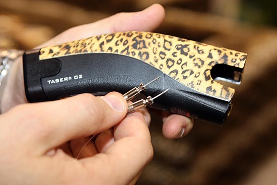 這款泰瑟槍的首要功能是防衛,能發射5萬伏特的高壓電脈沖。被擊中者神經和肌肉系統暫時癱瘓,失去行動能力。其不凡之處在于它內置有一臺mp3音樂播放器,存儲器容量1G。新華社/法新