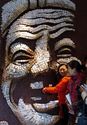 圖為博覽館中用麻將拼成的人物面部造型。