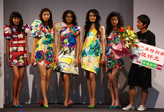 日前,ESMOD·北京高級時裝設計學院2008年學生畢業作品展演在北京舉行。圖為模特們在展示畢業生作品。
