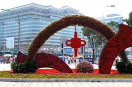 安放在西單附近的一座立體花壇雕塑《中國結》。隨著奧運會開幕日期的臨近,北京市長安街的道路兩旁陸續增添了許多造型獨特、寓意深刻的花壇雕塑,姹紫嫣紅的鮮花把這條“首都第一景觀大道”裝點得格外誘人、靚麗。