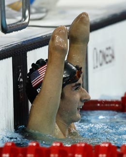 9月10日,美國選手羅伊·佩金斯在獲勝后慶祝。當日,在北京2008年殘奧會S5級男子50米蝶泳決賽中,美國選手羅伊·佩金斯以35秒95的成績獲得冠軍并打破世界紀錄。