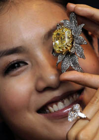 估價5800萬至7400萬港元的熱門拍品——迄今國際拍賣市場上最大的鮮彩黃鉆流拍。新華社記者:呂小煒