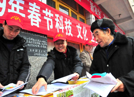 云南省昭通市水富縣兩鄉一鎮在四川汶川特大地震中受災。臨近春節,當地舉行送溫暖科技、文化、衛生、計生“四下鄉”活動,深入地震災區各村寨,將春聯、年畫、宣傳畫、衛生用品及抗震、禁毒、農業科普等宣傳手冊送給群眾。