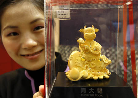 隨著農歷牛年的臨近,各類牛黃金飾品紛紛面市。一款款栩栩如生、憨態可掬的“金!笔艿奖姸嘞M者的青睞。