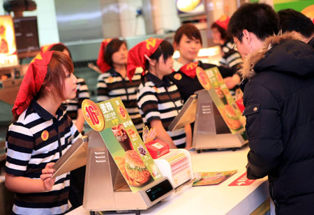 2月4日,麥當(dāng)勞(中國)有限公司在上海宣布,將在全國范圍的餐廳推出16.5元“天天超值套餐”。據(jù)稱,該系列套餐的價格優(yōu)惠高達(dá)32.6%。此舉顯示洋快餐巨頭為刺激銷量增長,以“超值套餐”的促銷方式調(diào)低產(chǎn)品的實際售價。圖為顧客在上海一麥當(dāng)勞餐廳內(nèi)購買食品。