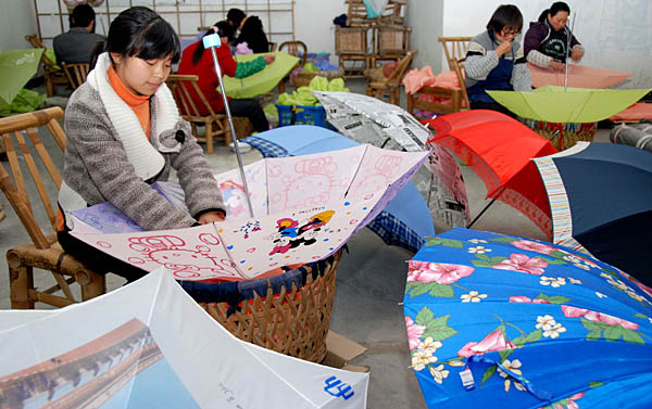| 江西省婺源縣紫陽鎮(zhèn)返鄉(xiāng)農(nóng)民工楊紅去年回鄉(xiāng)后自主創(chuàng)辦了陽光傘廠,招收了幾百名返鄉(xiāng)農(nóng)民工,生產(chǎn)工藝傘、帽傘、遮光傘等各種中低檔雨傘,90%的產(chǎn)品出口美國(guó)、烏克蘭等國(guó)家,走出了受“金融風(fēng)暴”影響而失業(yè)的農(nóng)民工創(chuàng)業(yè)就業(yè)再發(fā)展的成功之路。新發(fā)社發(fā) | |