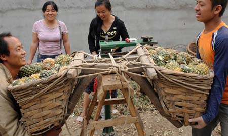 近年來,地處中越邊境的云南省河口瑤族自治縣的各族群眾加大優質高效農業和特色農業的開發力度,因地制宜種植香蕉、無眼菠蘿、芒果和西番蓮等熱帶、亞熱帶水果,并采用產供銷一體化的管理模式,實行產業化經營,為當地農民尋找到新的致富門路。如今菠蘿已是河口縣的拳頭產品之一,種植面積近10萬畝,年產鮮果7萬多噸。圖為幾名當地群眾在地處中越邊境的云南省河口瑤族自治縣將新鮮菠蘿過秤稱重,準備運往外省銷售。