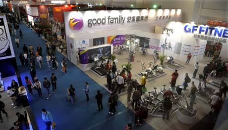 4月23日,2009(第24屆)中國國際體育用品博覽會在北京國際展覽中心新館開幕。本屆體博會共吸引了來自全球30多個國家和地區的900多家體育用品企業參展,涵蓋3000多個體育品牌,展覽面積超過9萬平方米。圖為觀眾在室內健身器材館參觀。