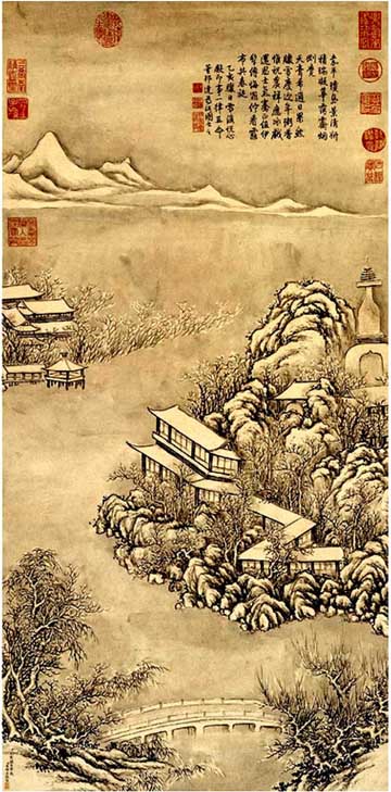 3幅清朝宮廷收藏后散佚民間的古畫,在嘉德2009春季拍賣會上以總計1.11億元的價格成交。董邦達的《雪后悅心殿詩意圖》拍得人民幣795.2萬元。本報記者汪永基攝 |