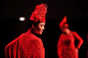 來自俄羅斯圖瓦共和國的模特在展示蒙古族現代時裝。