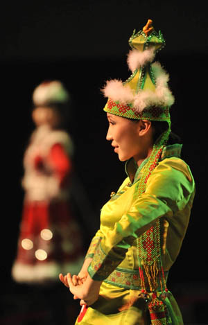 新疆維吾爾自治區的蒙古族模特在展示時尚的蒙古族服飾。