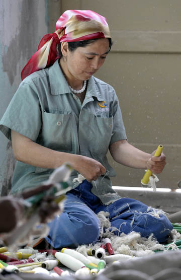 7月30日,新疆天盛實業有限公司的一位維吾爾族女工在車間工作。 位于新疆石河子國家級經濟技術開發區的天盛實業有限公司因地制宜,利用靠近棉花產地的優勢積極發展棉紡織業,現已形成年產50萬錠的生產規模,同時從和田、喀什、吐魯番等地大量招收少數民族員工,解決了他們的就業問題。目前公司有2200多名維吾爾族、回族、柯爾克孜族、蒙古族、哈薩克族等少數民族員工,占員工總數的2/3。