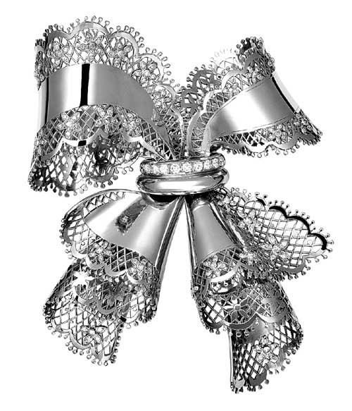 蝴蝶結(jié)是高級(jí)訂制時(shí)裝的基本裝飾元素,長(zhǎng)久以來(lái)也是法國(guó)珠寶品牌梵克雅寶優(yōu)美傳統(tǒng)的組成部分。無(wú)論簡(jiǎn)單還是復(fù)雜,蝴蝶結(jié)都以其獨(dú)具的立體美感襯托出女性雍容的美態(tài)。布料和珠寶相互幻化難分彼此,精巧的手工甚至令L ace胸針透現(xiàn)柔麗肌膚。這枚于1945年創(chuàng)作的黃金蝴蝶結(jié),飾有黃金蕾絲花邊,綴飾的鉆石小花更顯精巧工藝。