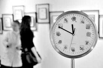 山東收藏家林一葦為虎年春節(jié)獻(xiàn)上19年收藏的愛情郵票,讓愛的溫暖和祝福陪伴廣州市民度過浪漫春節(jié),《玫瑰花的問候——世界愛情郵票環(huán)球展》2月6日至28日在廣州購書中心展出。據(jù)悉,林一葦先后投資六、七百萬元一共收藏了136個國家和地區(qū)的30萬余枚以愛情為主題的郵票,此次展出的是其中的4000余枚。圖為展廳內(nèi)隨處可見的愛情郵票時鐘。新華社記者 梁志瑋/攝