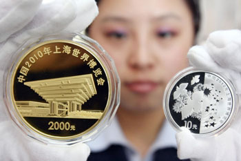 中國人民銀行分別于2009年6月10日和2010年4月22日發行中國2010年上海世界博覽會金銀紀念幣第1組一套和第2組一套。第一組紀念幣共3枚,其中1/3盎司金幣1枚,1盎司銀幣2枚;第二組紀念幣共4枚,其中金幣2枚,1盎司銀幣2枚,除了1/3盎司金幣1枚外,另外1枚金幣為5盎司,均為中華人民共和國法定貨幣。 |