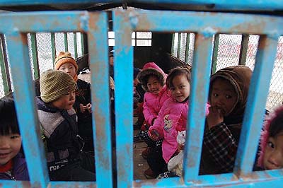 1月22日,孩子們擠在改造的人力校車里前往幼兒園。安徽省阜陽市的幼兒園使用改裝過的人力板車或三輪車作為接送孩子校車的現象十分普遍。這種車每輛可載20多個小孩,防護性能極差,存在重大的安全隱患。