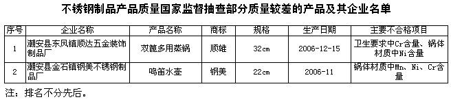 為維護(hù)消費(fèi)者的合法權(quán)益,促進(jìn)不銹鋼制品行業(yè)健康發(fā)展,國(guó)家質(zhì)檢總局組織對(duì)不銹鋼制品產(chǎn)品質(zhì)量進(jìn)行了國(guó)家監(jiān)督抽查,共抽查了廣東、福建、浙江、上海等4個(gè)省、直轄市30家企業(yè)生產(chǎn)的30種不銹鋼制品,其中不銹鋼器皿28種,不銹鋼餐具2種,產(chǎn)品抽樣合格率為83.3%。