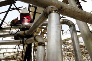 昨天(27日),記者從城建集團(tuán)了解到,“鳥(niǎo)巢”的雨虹利用系統(tǒng)近日開(kāi)始安裝。這一系統(tǒng)年處理雨水5萬(wàn)立方米,將用于跑道、道路清洗和園林澆灌等九大方面。 據(jù)了解,雨虹系統(tǒng)利用分布在鳥(niǎo)巢鋼結(jié)構(gòu)屋面和地面草坪等處的近千個(gè)雨水收集口將雨水收集起來(lái),通過(guò)電腦控制的管道網(wǎng)絡(luò)進(jìn)入地下蓄水池,經(jīng)過(guò)過(guò)濾凈化后再次利用。 圖為工人們正在“鳥(niǎo)巢”鋼結(jié)構(gòu)頂面懸空安裝雨虹系統(tǒng)輸水管網(wǎng)。