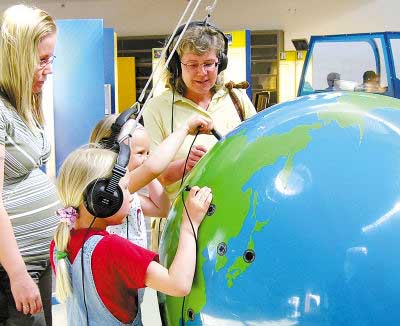 5月27日,在芬蘭首都赫爾辛基市附近的赫尤里卡科學中心主展廳的地球儀旁,芬蘭兒童頭帶耳機,將耳機插頭插在地球儀不同的地區,可以聽到世界各地60種語言的問候。赫尤里卡科學中心是一個深受芬蘭兒童歡迎的科技館。它通過其設計新穎、富有哲理的展品對兒童進行深入淺出、寓教于樂的科普教育,激發他們對科學的興趣。