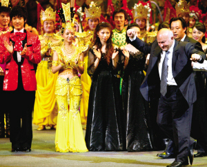 前天(27日)晚上,在俄羅斯首都莫斯科舉行的“魅力北京”文藝演出謝幕式上,莫斯科市市長盧日科夫(前右)伴隨著音樂跳起舞。當天,俄羅斯“中國年”的重要活動之一——莫斯科“北京周”正式拉開帷幕。本次“北京周”活動旨在通過大型展覽、文藝演出、各類交流活動等向俄羅斯人展現一個全新的北京。