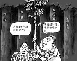 這也就意味著,制約公眾工資增長“感覺”的,不單是收入的絕對增長幅度,還有住房、養老、醫療、教育、保險等公共產品的供給與保障。但事實上,目前這些供給卻難以讓人樂觀:房價居高不下甚至連年飛漲,看不起病、上不起學、買不起房的新“三座大山”壓得漫漫紅塵中的平頭百姓們喘不過氣來。在這種情況下,公共產品供給不足的這一短板,就在很大程度上折抵、消弭了工資增長帶給公眾的“喜悅”,從而讓多數人“沒感覺”。