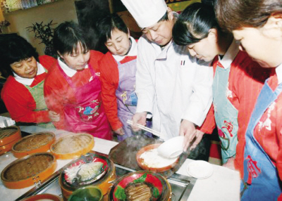 據民政部門家政服務中心介紹,今年“金豬寶寶”扎堆,月嫂吃香,而寶寶家庭對月嫂業務能力要求普遍提高,不僅要求能干,還要求技術科學,例如最基本的做飯,家庭除要求可口之外,更多提出要保證營養。圖為月嫂在專業蒸菜大廚的指導下學習蒸菜烹飪。 |