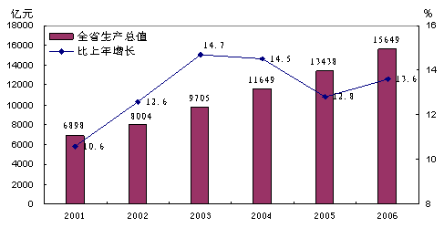 初步核算,2006年,全省生產(chǎn)總值為15649億元,比上年增長(zhǎng)13.6%(見(jiàn)圖1)。其中第一產(chǎn)業(yè)增加值923億元,第二產(chǎn)業(yè)增加值8438億元,第三產(chǎn)業(yè)增加值6288億元,分別增長(zhǎng)3%、13.9%和15.1%。人均GDP為31684元(按年平均匯率折算為3975美元),增長(zhǎng)11.6%。三次產(chǎn)業(yè)增加值結(jié)構(gòu)從上年的6.6∶53.4∶40調(diào)整為5.9∶53.9∶40.2。