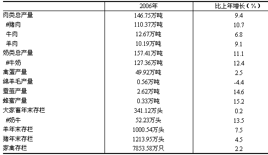 畜牧業(yè)生產(chǎn)穩(wěn)定發(fā)展,產(chǎn)業(yè)化步伐加快。2006年,我省繼續(xù)堅持把畜牧業(yè)作為農(nóng)業(yè)結(jié)構(gòu)調(diào)整的主導產(chǎn)業(yè),以市場為導向,以產(chǎn)業(yè)化發(fā)展為目標,以奶業(yè)發(fā)展為突破口,狠抓疫病防治、健全良種建設(shè)、推廣標準化飼養(yǎng)、大力實施科技興牧戰(zhàn)略,促進了畜牧業(yè)生產(chǎn)方式的轉(zhuǎn)變和畜產(chǎn)品生產(chǎn)能力的提高。